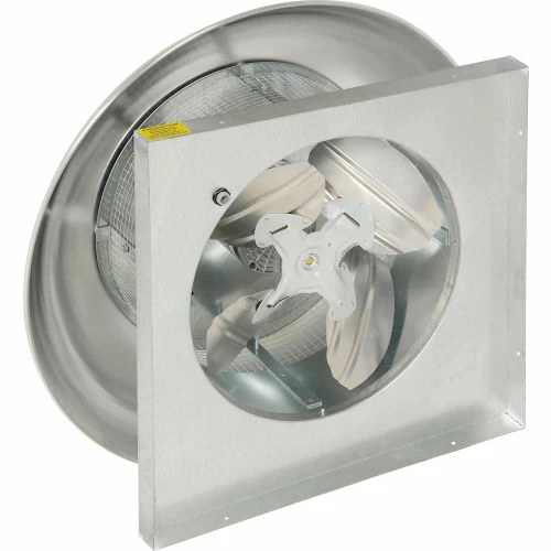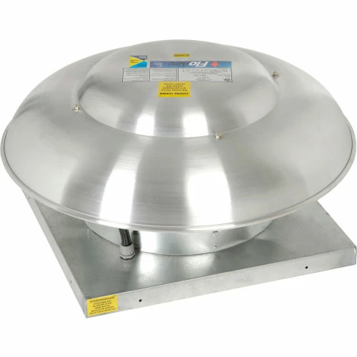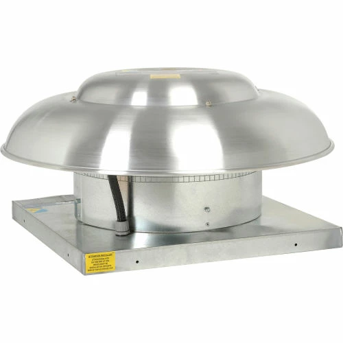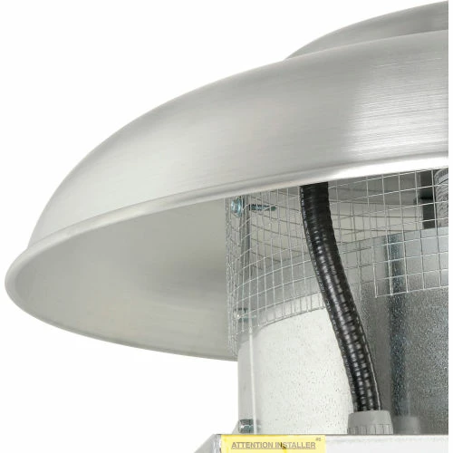 This downblast fan features die formed axial fan blades riveted to a steel hub. Suitable for roof or wall mounting. Spun aluminum housing for weather resistant durability. Includes birdscreen, totally enclosed, permanently lubricated, ball bearing motor and a disconnect switch, rated for 110 degrees F. 115V Single Phase operation. 1160 CFM. Horsepower rating based upon maximum speed/load.