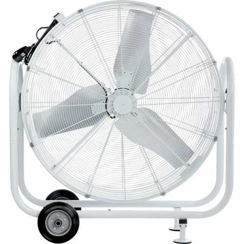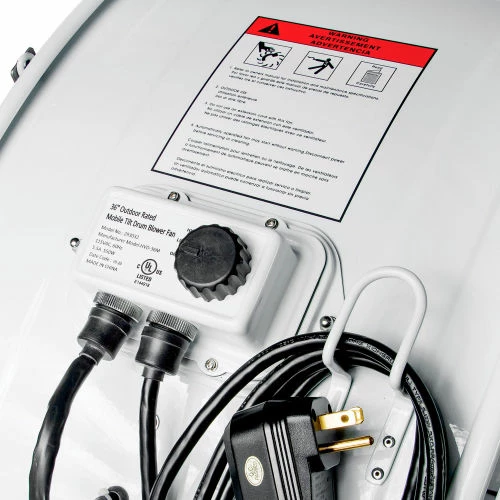 The Global Industrial 36″ Mobile tilt drum blower fan delivers 2 speeds of cooling airflow for garages, warehouses and agriculture facilities. This direct drive fan features zinc plated, UV and corrosion resistant steel body for lasting performance. This Phase 1, outdoor rated, free standing unit is designed to accommodate various on-site jobs such as barns, factories, and more. With an Igress Protection rating of IP44, this fan is approved for outdoor usage. Fan motor is totally enclosed for complete protection and 3 aluminum blade count provides CFM high of 12241. Includes 9′ SJTW power cord with NEMA Plug Configuration. Max ambient temperature is 104°F. UL, cUL listed. This product has a limited warranty of 1 year.