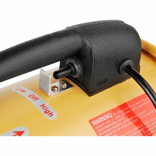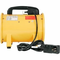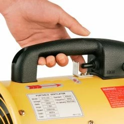Exhaust fans help ventilate and cool manholes, tanks and crawl spaces. Made using durable steel housing with a yellow finish. These two-speed blowers are lightweight and portable with an easy-carry handle. Powder coated steel blade guards enclose housing for safety. Rubber feet on base help minimize noise and reduce vibrations. The working ambient temperature range of this model is 0 – 40° C (32 – 104° F). Includes 10’L power cord. 120V. ETL, cETL Listed and conforms to UL507 Standard. This product has limited warranty of 1 year. Horsepower rating based upon maximum speed/load.