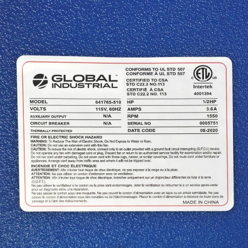 SKU: Global Industrial WB641765 Categories: Blowers, Fans & Blowers, Portable Tags: 1/2 HP, 1550 rpm, 4000 CFM, 60 Hz, Assembled, Blue, Global Industrial, HVAC & Fans
