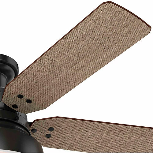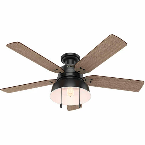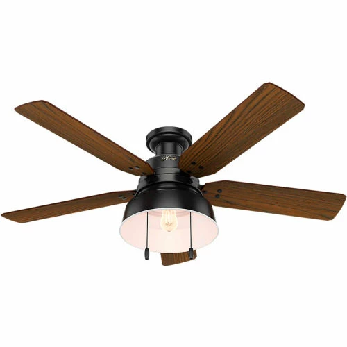 Industrial and rustic design come together on the Mill Valley with details including vintage style rivets securing the blades, coin-edge thumb screws and a barn style open hood light. Style meets performance with the Mill Valley’s white hood reflector that maximizes light from a vintage style LED Edison bulb. Damp rated and offered in a black housing finish, the Mill Valley will add a modern essence to your casual farmhouse living spaces and patios. The flushed mount makes this fan perfect for rooms with lower ceilings.