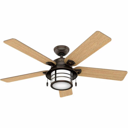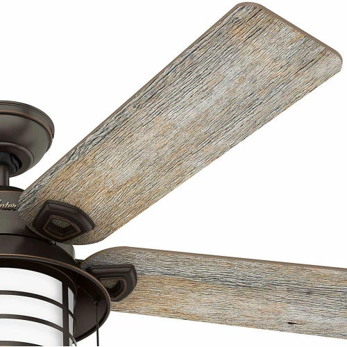 Clean lines and maritime style bring the Key Biscayne to life. The fan is outfitted with a blade finish reminiscent of aged beachwood, rustic weathered finishes, and a lantern-style light kit. The design brings a nautical feel to any room of your house. This casual fan is damp-rated for moist conditions in covered porches or sunrooms.