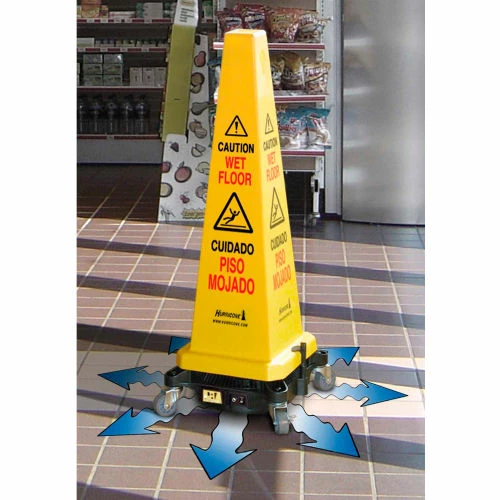 Decrease your floor drying time by up to 90%. Hurricone Cordless Floor Dryer dries floors 360° around the unit and up to 15 feet in diameter. On top sits a 36″, 4-sided, multi-lingual safety cone. Cordless and rechargable, a replaceable battery pack runs up to 8 hours. LED and audible battery level indicator warns of low battery voltage. Battery saver circuit automatically limits battery discharge to optimize battery life. Battery pack can be charged internally or removed and charged separately to avoid taking floor dryer out of service. Safety cones can be stacked for easy storage and transport. Meets OSHA and ANSI standards. 1 Year Warranty.