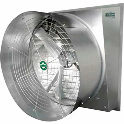 Eliminates heat build up in barns, greenhouses and industrial buildings. Heavy-duty 18 gauge galvanized steel housing and venturi support 12 gauge motor mount. Includes aluminum shutters on intake with tie bars and shutter clips for secure closure. Heavy-duty galvanized X-frame motor mount provides rigidity for increased life and quieter operation. Balanced galvanized steel fan blades offer smooth operation. Enclosed motor has sealed ball bearings and automatic thermal overload protection for long life. Includes a heavy gauge galvanized cone with safety cone guard. Motor is UL/ULC recognized. Easy assembly. 2 Year Limited Warranty. Horsepower rating based upon maximum speed/load.