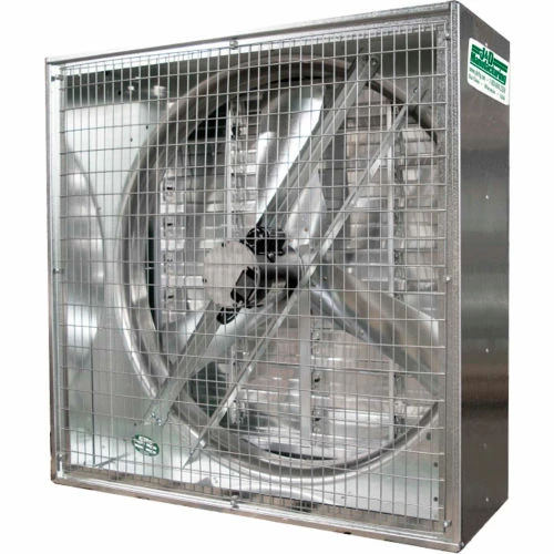 Eliminates heat build-up in barns, greenhouses and industrial buildings. Exhaust fans feature external aluminum shutters with tie bars to help prevent shutter flapping. Heavy-duty 18 gauge steel housing. Hot dipped after welded, galvanized 1″ x 2″ x 12 gauge removable wire mesh guards. Includes poly guard clips to reduce vibration. Totally enclosed motor has sealed ball bearings and automatic thermal overload protection. Galvanized X-frame motor mount provides rigidity for long life and quiet operation. 3 galvanized steel blades are balanced for smooth operation. Exhaust fans include provisions for hardwire installation. Field convertible 115/230V. Motor is UL/ULC recognized. 2 Year Limited Warranty. Horsepower rating based upon maximum speed/load.