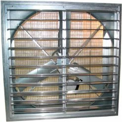 Eliminates heat build-up in barns, greenhouses and industrial buildings. Exhaust fans feature external aluminum shutters with tie bars to help prevent shutter flapping. Heavy-duty 18 gauge steel housing. Hot dipped after welded, galvanized 1″ x 2″ x 12 gauge removable wire mesh guards. Includes poly guard clips to reduce vibration. Totally enclosed motor has sealed ball bearings and automatic thermal overload protection. Galvanized X-frame motor mount provides rigidity for long life and quiet operation. 3 galvanized steel blades are balanced for smooth operation. Exhaust Fan includes a spring loaded belt tensioner, and pre-lubricated, sealed bearings that are rubber mounted to reduce blade fatigue. Exhaust fans include provisions for hardwire installation. Field convertible 230/460V. Motor is UL/ULC recognized. 2 Year Limited Warranty. Horsepower rating based upon maximum speed/load.