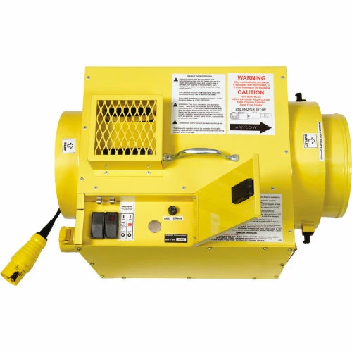 This in-line heating system with its propane-fired, heat-exchanger provides safe, warm breathing air during cold conditions. For tent/shelter or confined space heating. Airflow can cycle with heat or run continuous for confined space ventilation. Remote thermostat included. Up to 10 hours of continuous operation with standard propane cylinder tank. Heater attaches quickly and easily to blower. Output: 70,000 BTU/13.5kW. Includes propane regulator and connection assembly. Easy access top mounted heater control panel. IP20 rated enclosure. 15’/4.6m power cord with IP65 rain tested switch enclosure.