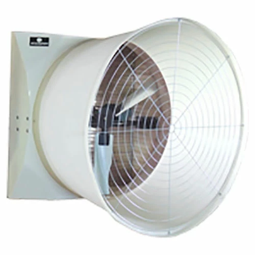 Schaefer 57″ fiberglass exhaust fan is the ideal solution for dairymen seeking superior performance and efficiency in a manageable package for tunnel and cross ventilation applications. Heavy-duty, UV protected, polyethylene cone maintains its shape and greatly increases fan performance. Built to last, and specifically designed to fit side-by-side in dairies with standard post spacings, Schaefer 57″ fiberglass exhaust fans deliver unrivaled return on investment. Ships fully assembled, complete with aluminum inlet shutter and self-adjusting belt tensioner. Cone added in the field.
