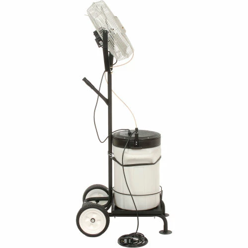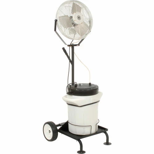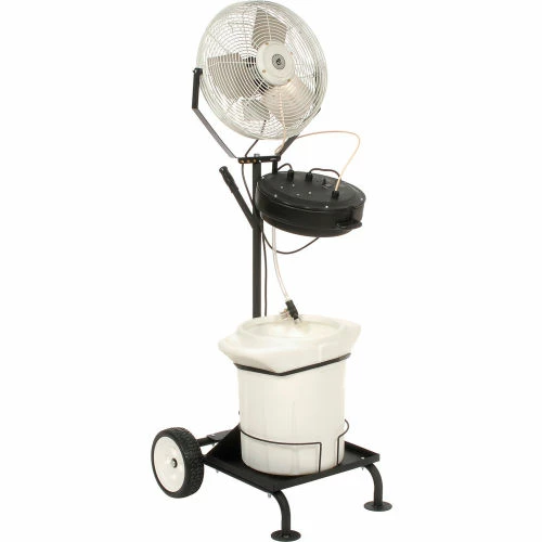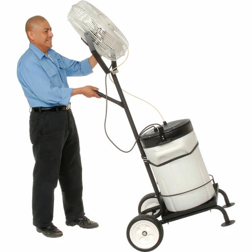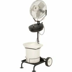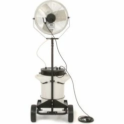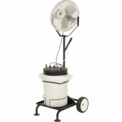 Lightweight, self contained misters allow easy transportation from site to site. Includes 10 gallon water cooler with 130 psi diaphragm pump. Enclosed 1/8 HP, single-phase motor provides 5750 CFM and is permanently lubricated for long life. Three 18″ aluminum blades are enclosed in spiral wire guards for safety. Toggle power switch allows fan only or fan with mist operation. Fan mount allows pivot-action for tilt angle adjustments. Includes 18’L SJT type, GFCI protected 3-conductor power cord. Dry storage is recommend. Meets OSHA standards. 1 Year Limited Warranty. Horsepower rating based upon maximum speed/load.